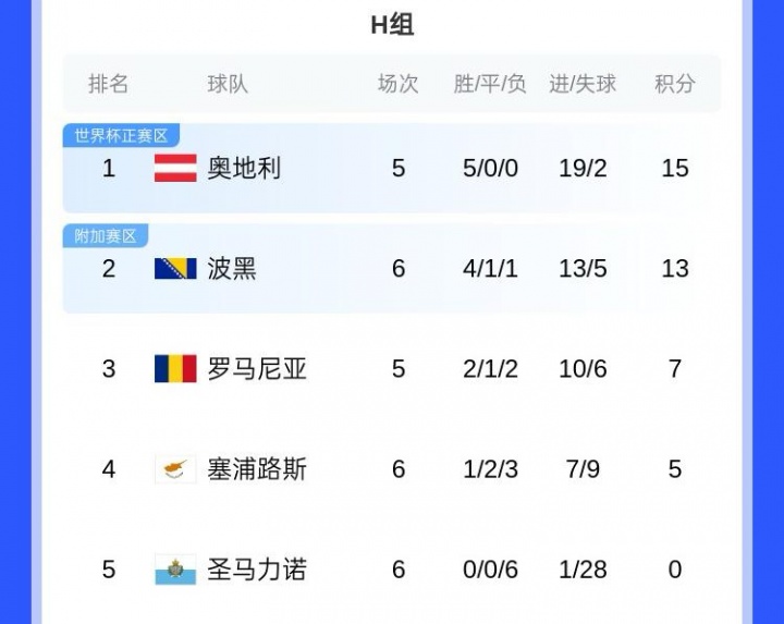 European World Cup Qualifying Group H: Austria leads with 5 consecutive wins, San Marino is at the bottom with 6 consecutive losses, goal difference -27