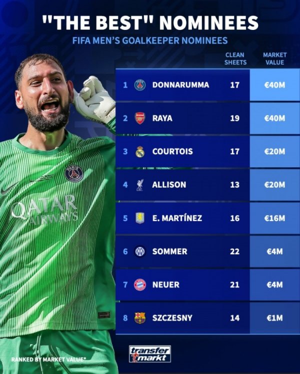 FIFA s best goalkeeper candidates worth ranking: Donnarumma, Raya top the list with 40 million euros