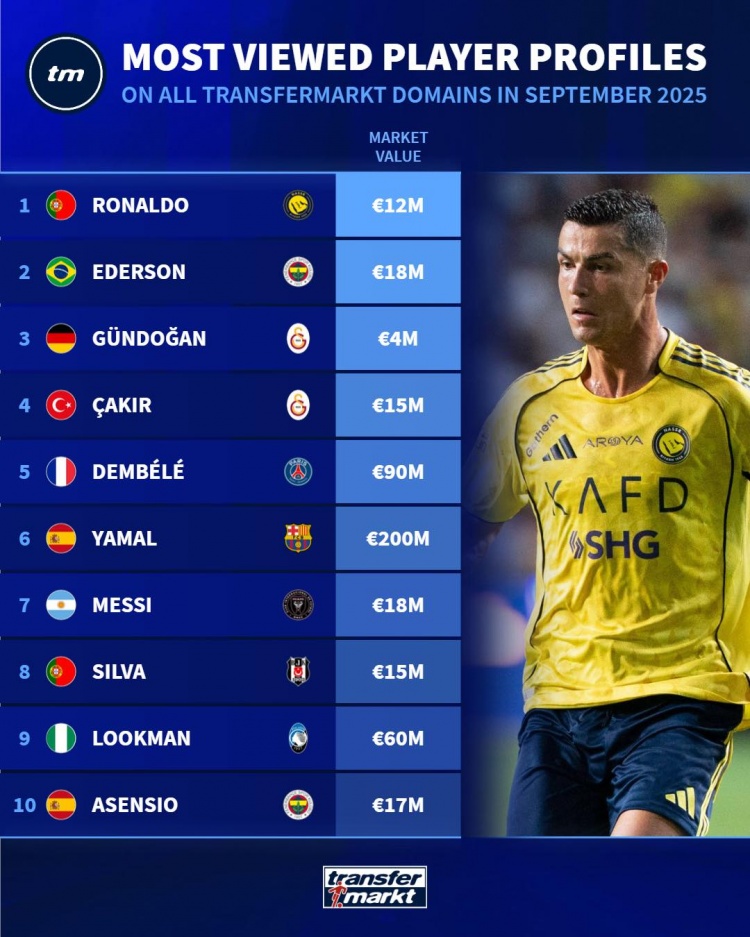 The German transfer market lists the player page views ranking in September, with Ronaldo ranked first, Ederson and Gundogan ranked second and third, and Messi ranked 7th.