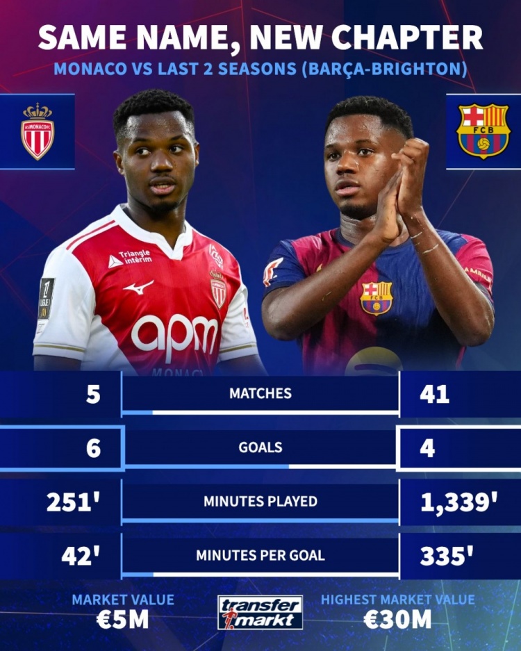 Fati joined Monaco on loan from Barcelona this summer. The German transfer market has compared Fati's data in Barcelona and Brighton in the past two seasons, as well as the data in Monaco this season.
