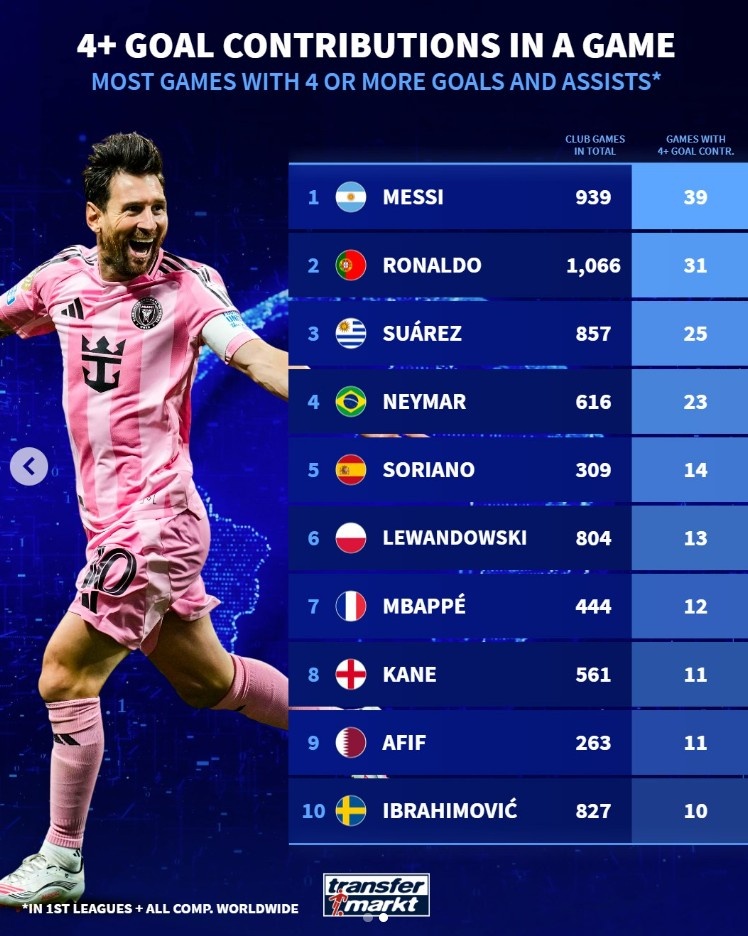 The club has participated in 4+ goals in a single game: Messi 39 times, Cristiano Ronaldo 31 times, Suja Neymar ranks third and fourth respectively